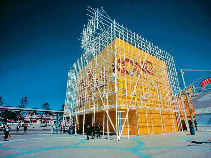 在1986年世博會會場,香港館以運輸、金融、貿易和通訊為主題,由本地建築師何弢博士設計展館,象徵「香港永遠在建築中」,動力源源不斷。香港館外牆上寫有「香港」兩個紅字,外圍髹上白色竹棚架圍繞。傳統竹棚象徵香港的靈活,以及港人努力不懈和追求進步的精神。