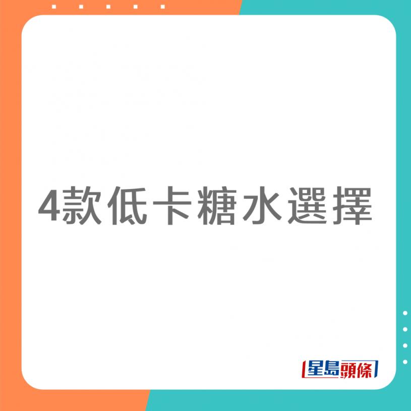 Nutri Life注册营养师李珮璇及杨盈希亦推介4款低卡糖水。《星岛头条》记者根据香港食物安全中心数据数据库及Nutri Life营养师提供的资料,综合如下: