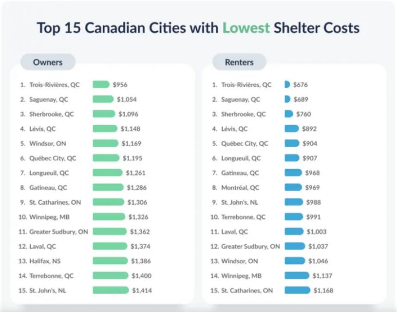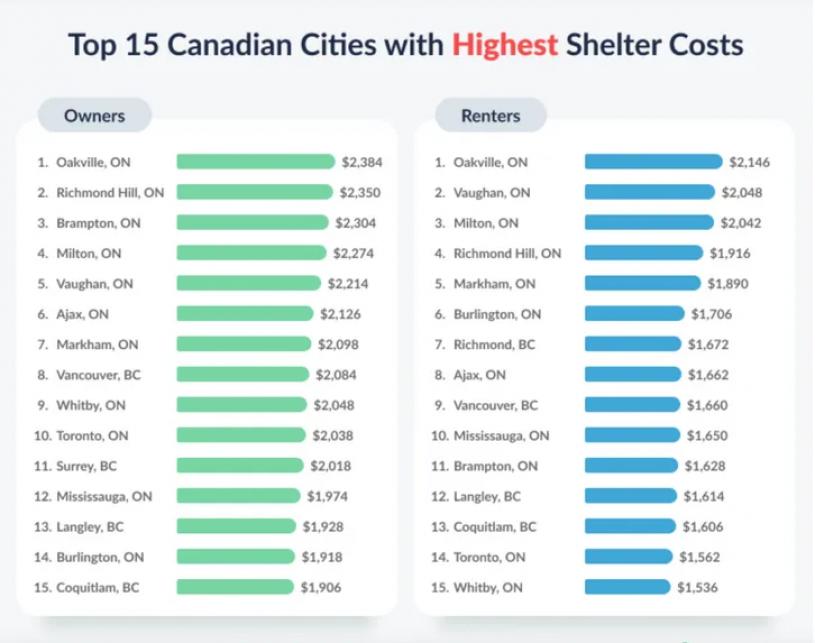 Oakville、旺市及Milton是安省住房成本最高的三個地區,租戶和業主每月支出超過2,000元,而烈治文山和賓頓的業主需支付的費用屬全省最高,分別為2,350元及2,304元。多倫多租客平均每月支付1,562元;業主則支付超過2,038元。