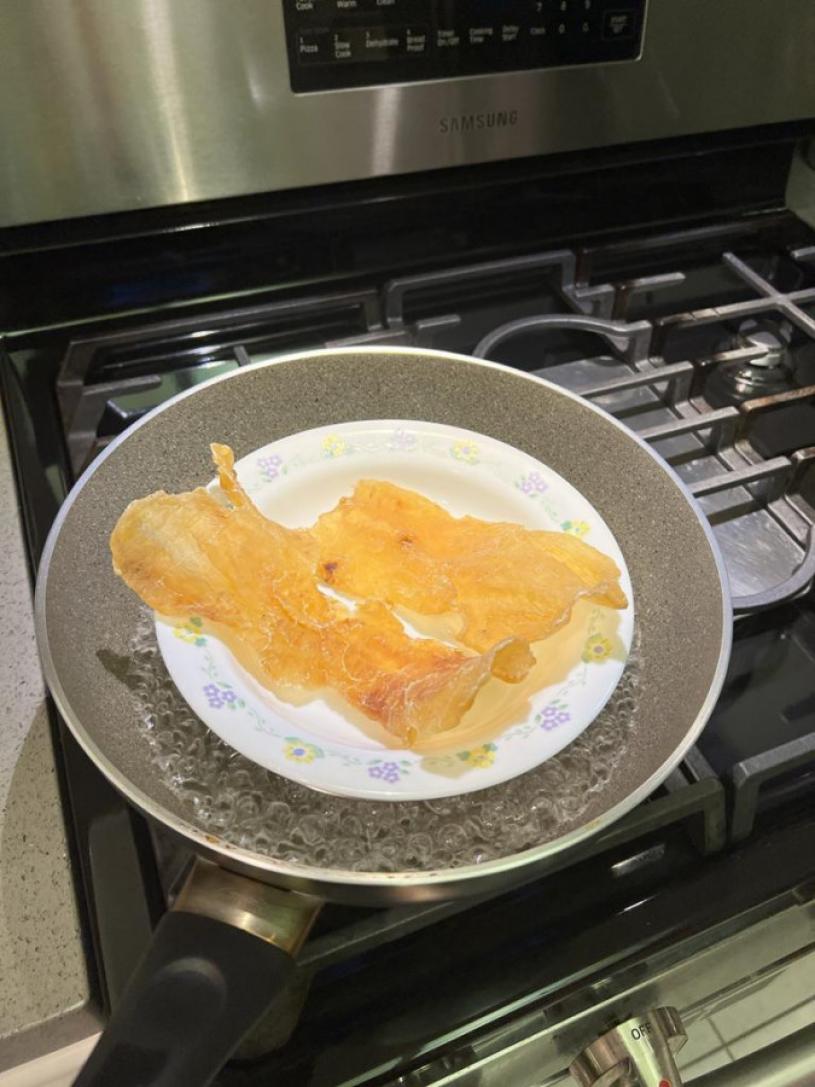 浸泡花膠前,先將花膠蒸大概7至10分鐘,令花膠變得軟身,方便清理花膠上的雜質,然後加入清水浸泡一日一夜(24小時)。