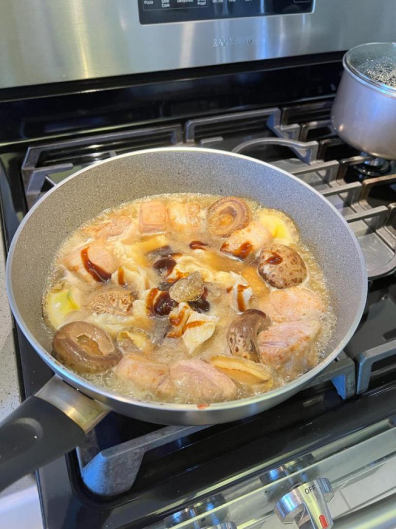 第二步:煮鮑魚海味,調味料為蠔油2湯匙,生抽1湯匙,老抽1茶匙,一塊小冰糖,胡椒粉及紹興酒少許,雞湯一杯半,燜煮約45分鐘至一小時。