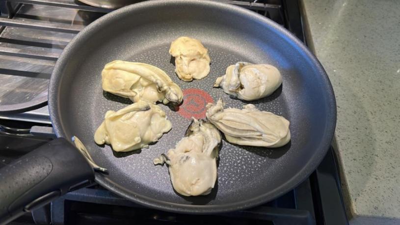 第三步:大蝦、生蠔、帶子解凍處理後,用少許鹽和胡椒粉醃製,拍上生粉煎熟備用。如用原粒瑤柱,則隔夜浸泡再蒸煮15分鐘。