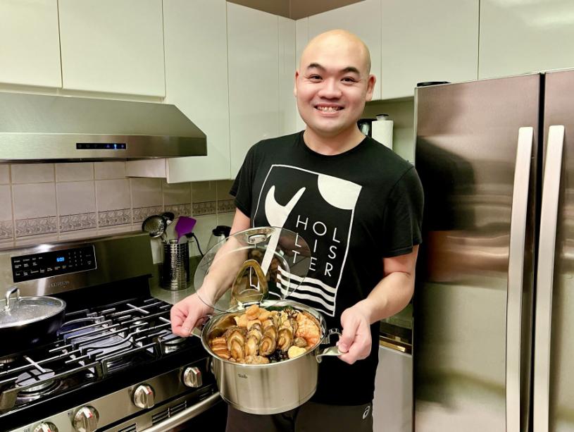 Donald Sir準備介紹的盆菜,主要以兩個步驟分開烹煮,第一部分為海味肉類烹調,第二部分為竹笙,蘿蔔,腐竹等一些放在盆菜底部的配料。