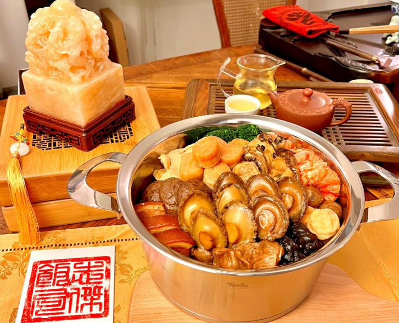 將剛剛燜好的豬肉放在最上層,冬菇、花膠、鮑魚等海味分開,將不同類食品放在盆菜上面的一個位置,再把煎好的海鮮類排好,西蘭花也加入作為裝飾。
