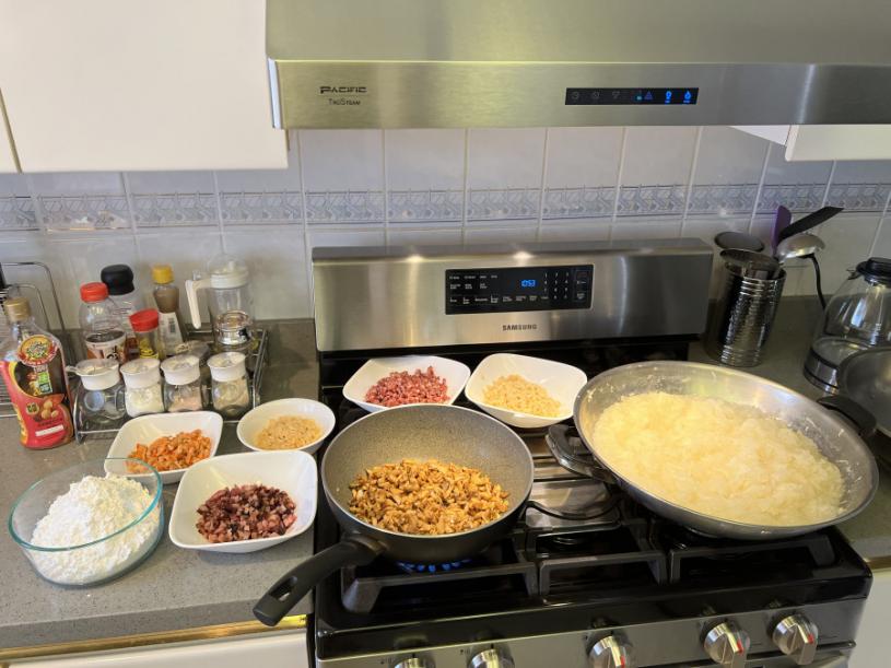 准备工作:腊肠,腊肉先蒸15分钟,取出放凉切成幼粒、冬菇,瑶柱可以浸泡水后蒸煮,虾米则可以当日才浸泡。