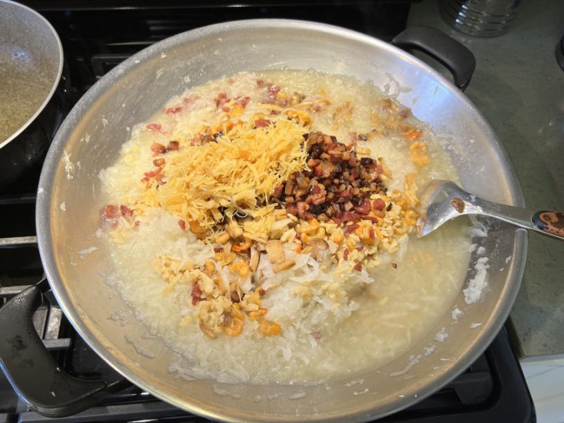 第四步:煮好的萝卜及材料混合一起,不断搅拌加入比较大量的胡椒粉,令到萝卜糕带出味道。