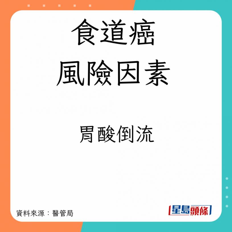 據香港醫管局最新統計數據,食道癌為香港第10位致命癌症,胃酸倒流為誘發因素之一。勞工處職業安全及健康部指,出現「胃酸倒流」是由於食道與胃部連接處的括約肌功能失常,令胃液及食物回流至食道,引起不適症狀,嚴重時可導致食道炎或食道狹窄等情況。