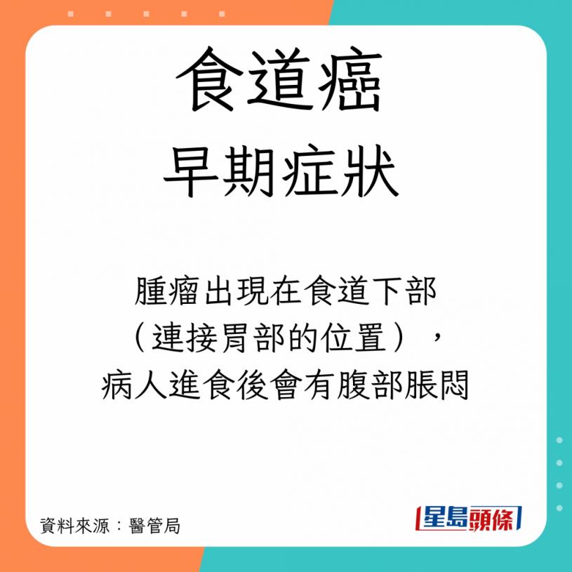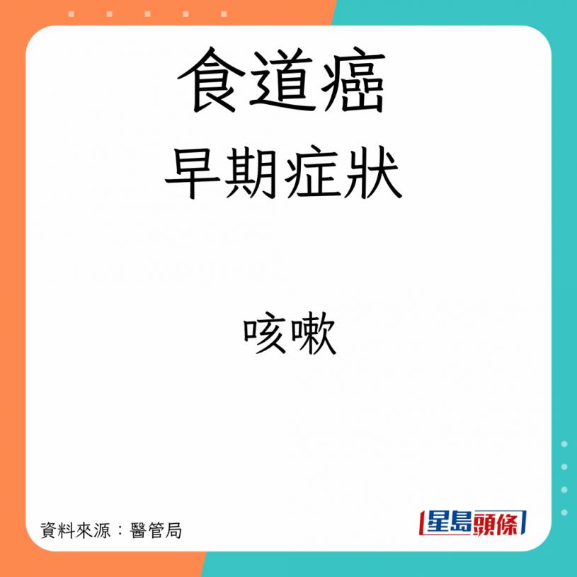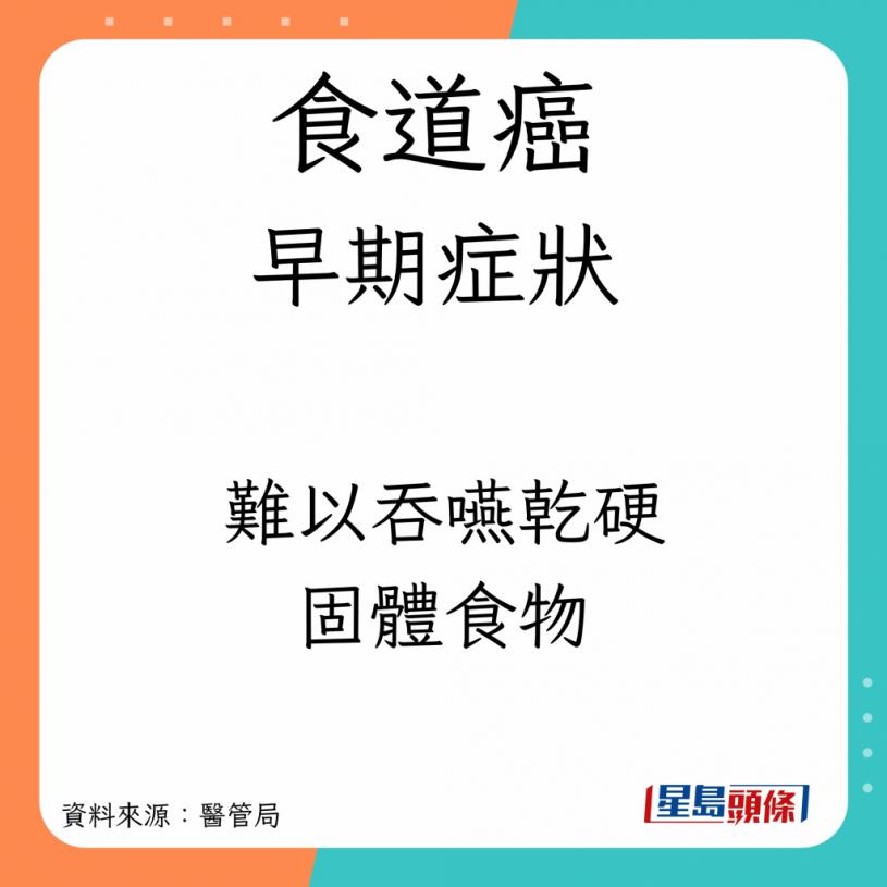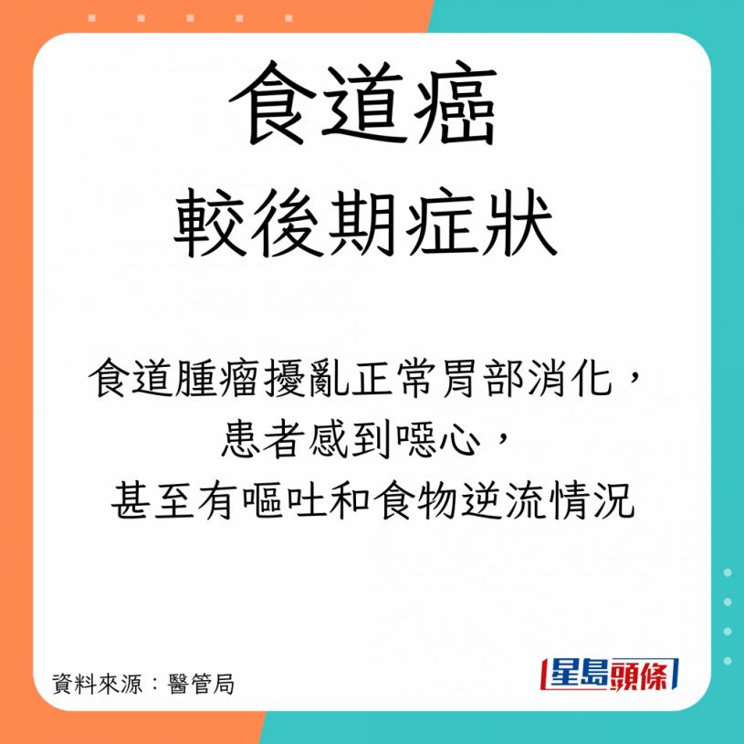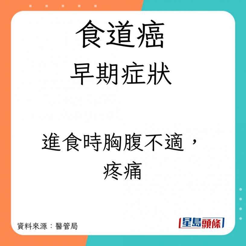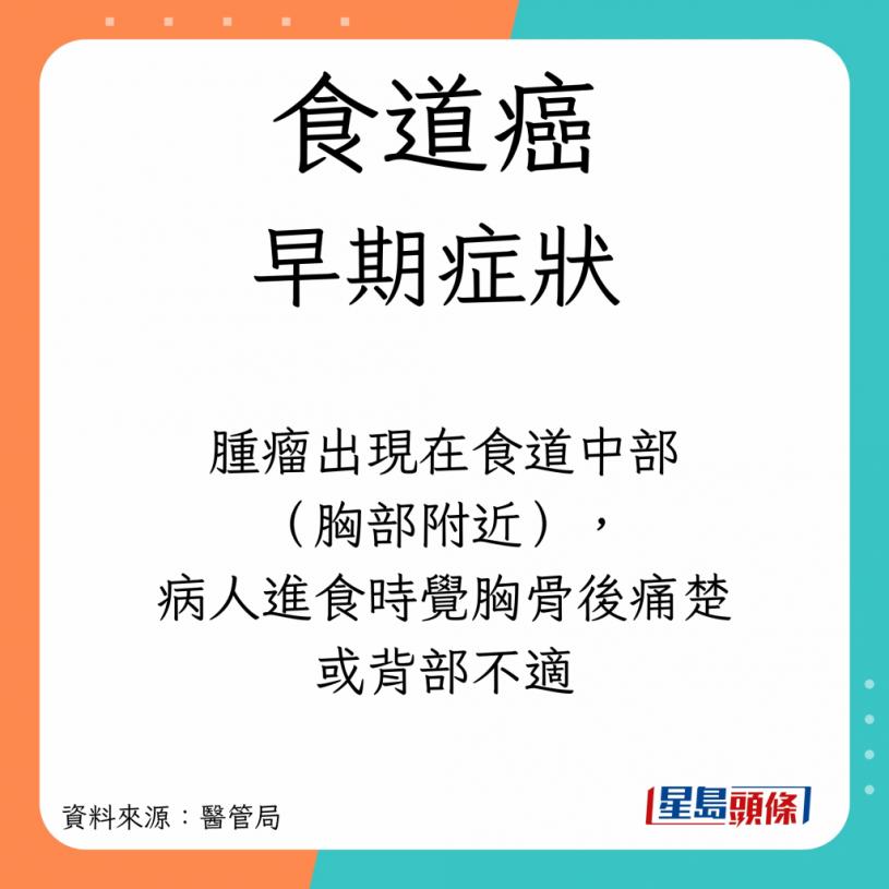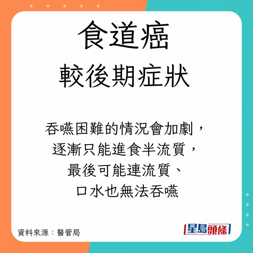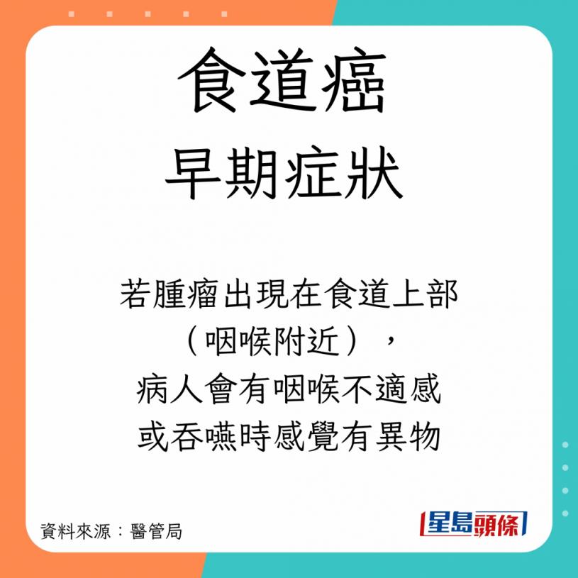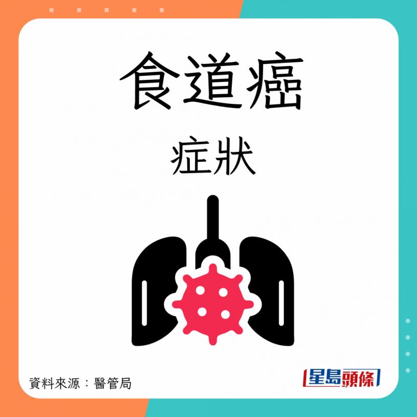 根據香港醫管局資料,大多數食道癌病人首先出現的徵狀是漸進性的吞嚥困難,但病人可能並不察覺或不自覺地改變進食習慣。食道癌早期及較後期症狀如下: