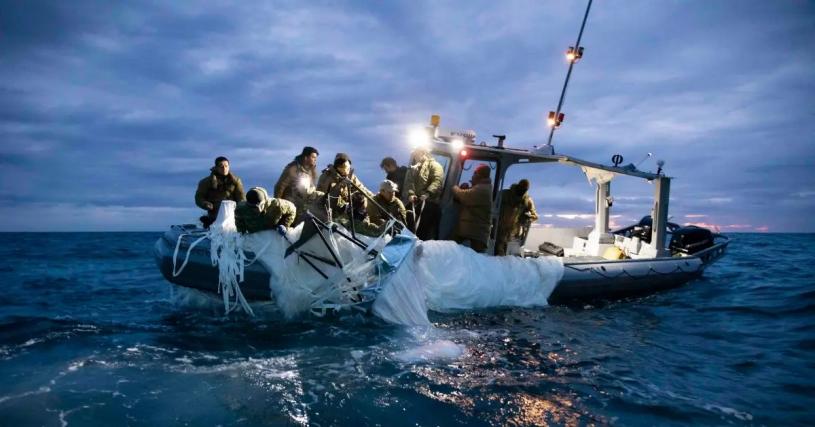 军方小组在南卡罗来纳州外海搜寻第一个物体,军方影像显示发现一大块气球皮,联邦调查局(FBI)正在保管碎片进行分析。