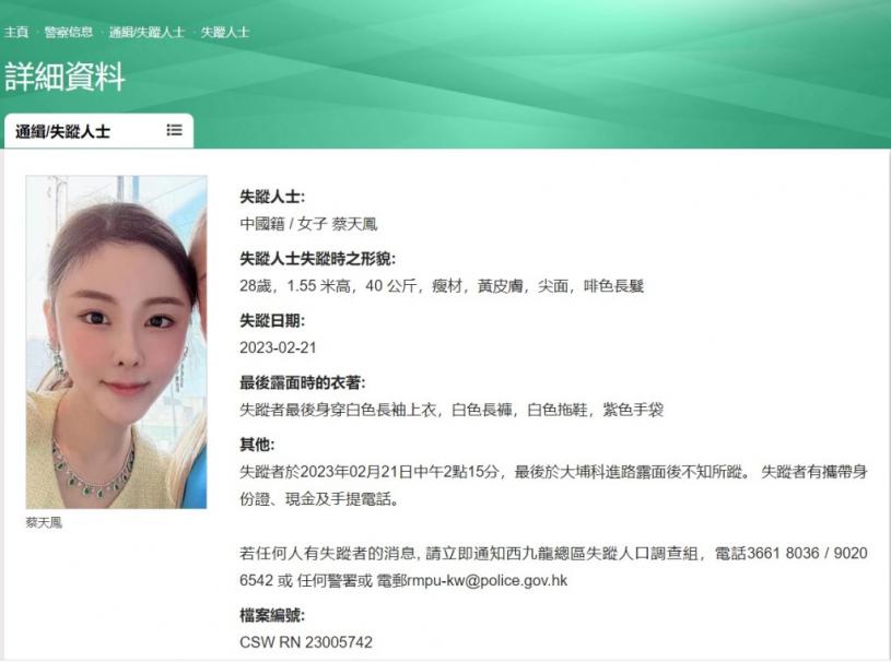 蔡天凤年约28岁,本月21日中午2点15分,最后于大埔科进路露面后不知所踪。失踪者有携带身份证、现金及手提电话。她最后身穿白色长袖上衣,白色长裤,白色拖鞋,紫色手袋。