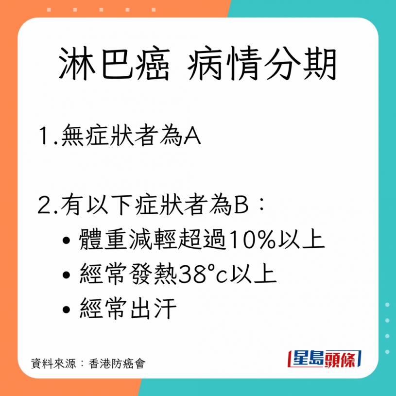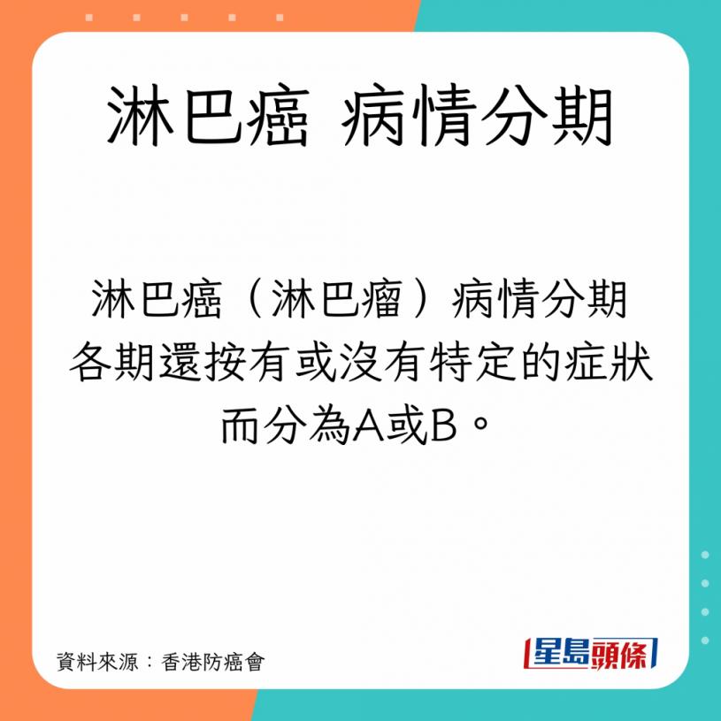 根據香港防癌會資料,評估淋巴瘤的蔓延程度,最先是採用1971年Ann Arbor會議所建議的方案,病情主要分為四期。第一及二期被視為早期,第三及四期則被為晚期。後來在1989年英國Cotswalds會議又為這方案作出了補充和修訂,制定了一個新的臨床分期方案,沿用至今。