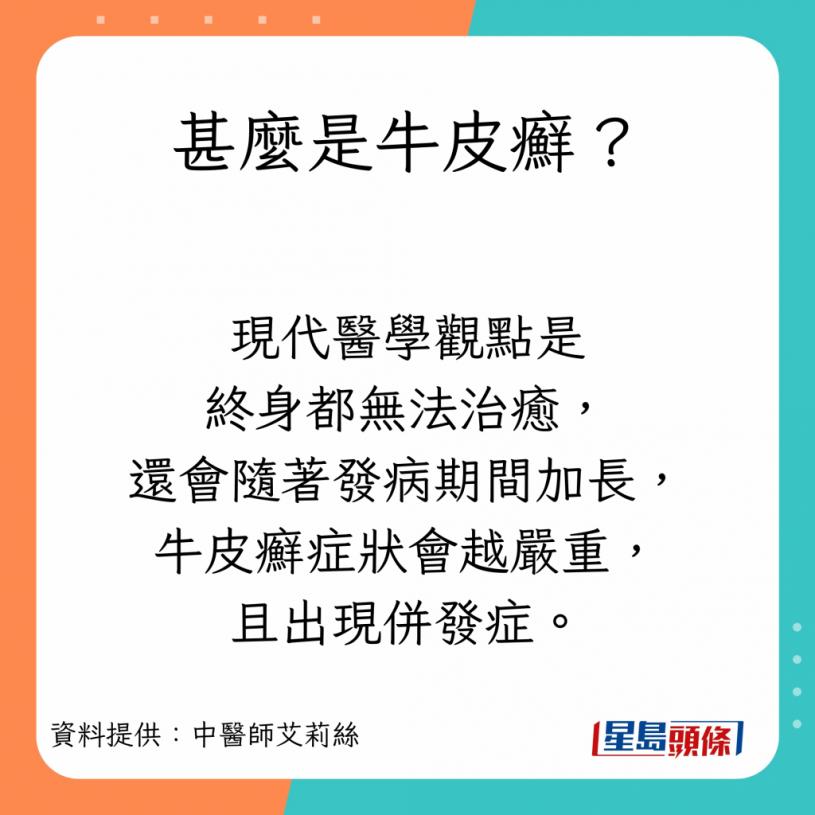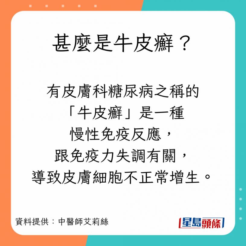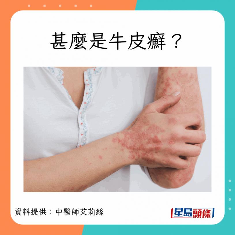 台灣中醫師艾利絲曾發文表示,牛皮癬屬於免疫方面的疾病,在冬季容易發作,發作時會感到皮膚痕癢,更會令皮膚變紅。