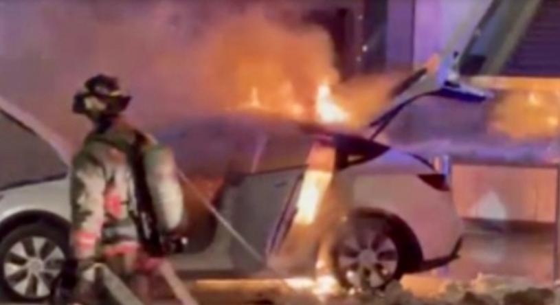 據警方稱,司機因失控與路邊車輛相撞。來自現場的圖片顯示,意外後特斯拉起火,消防員之後將火救熄。
