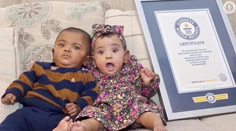 这对龙凤胎于2022年3月4日在安省出生,当时胎龄只有22周,比预产期提前了126天。他们打破了之前双胞胎提前了125天出生的纪录,此外,他们在出生时也是体重最轻的双胞胎,Adiah重330克,Adrial重420克。