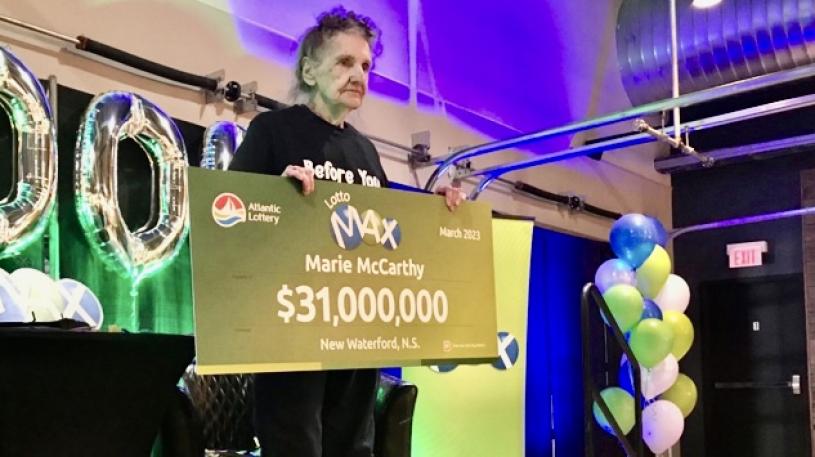 这张Lotto Max彩票的中奖者是83岁的Marie McCarthy,她的孙子Jeff在1月31日送她生日礼物,其中包含了这张彩票。彩票是在Emerald Street的Needs便利店购买的,此商店将获得1%的销售奖金。