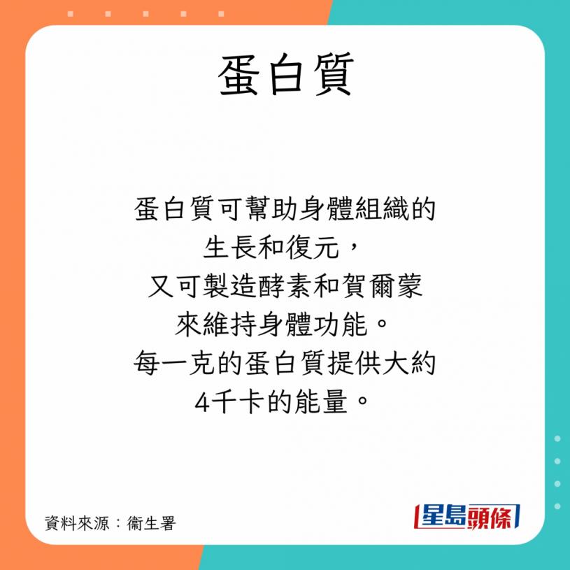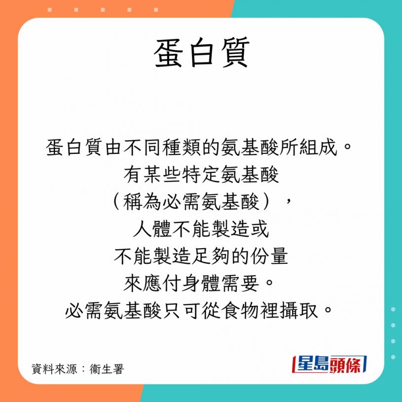 根據香港衞生署資料,蛋白質由不同種類的氨基酸所組成。有某些特定氨基酸(稱為必需氨基酸),人體不能製造或不能製造足夠的份量來應付身體需要。必需氨基酸只可從食物裡攝取。蛋白質可幫助身體組織的生長和復元,又可製造酵素和賀爾蒙來維持身體功能。每一克的蛋白質提供大約4千卡的能量。