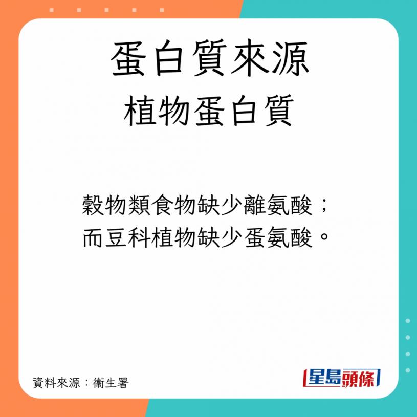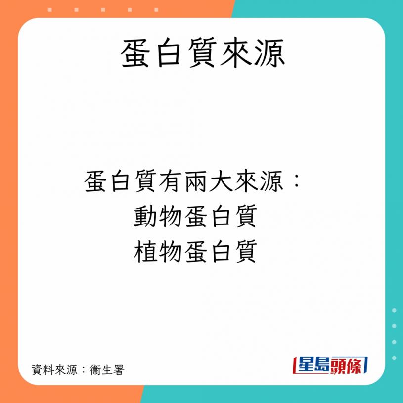 衞生署指,蛋白質有兩大來源:動物蛋白質、植物蛋白質。動物蛋白質包含所有人體所需的必需氨基酸,因此它們被視為「完全蛋白質」。動物蛋白質食物例子為:肉類、家禽、魚類、雞蛋和牛奶。