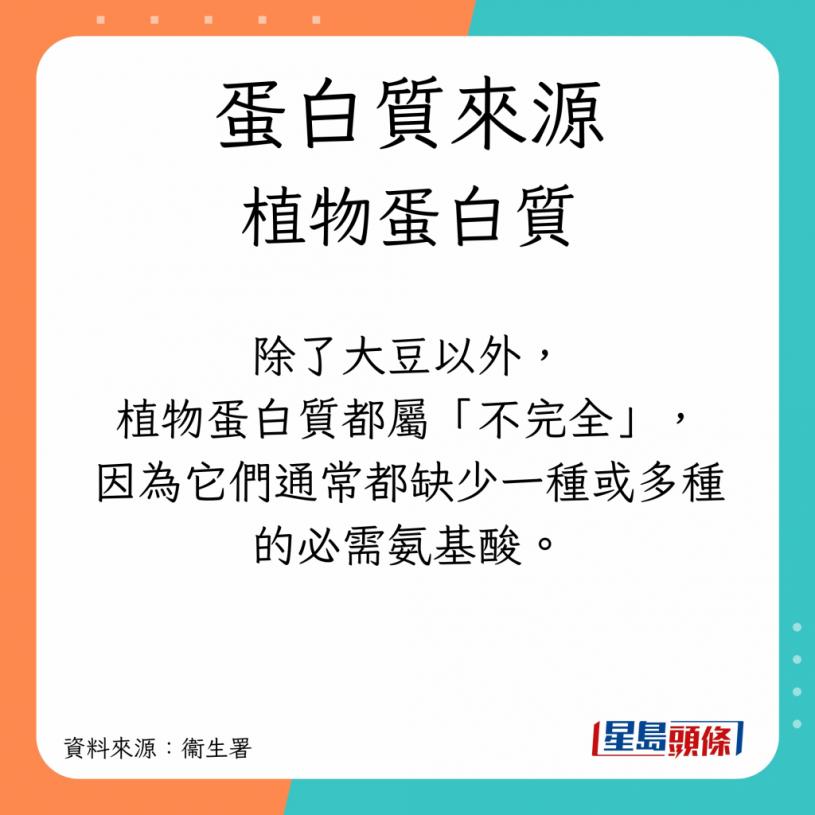 除了大豆以外,植物蛋白質都屬「不完全」,因為它們通常都缺少一種或多種的必需氨基酸。例如,穀物類食物缺少離氨酸;而豆科植物缺少蛋氨酸。然而,進食不同的植物食品(如豆科植物與穀物類食物、豆科植物加果仁或種子)卻可以提供足夠的必需氨基酸。植物蛋白質食物例子為:豆類、穀類食物、果仁和乾豆。