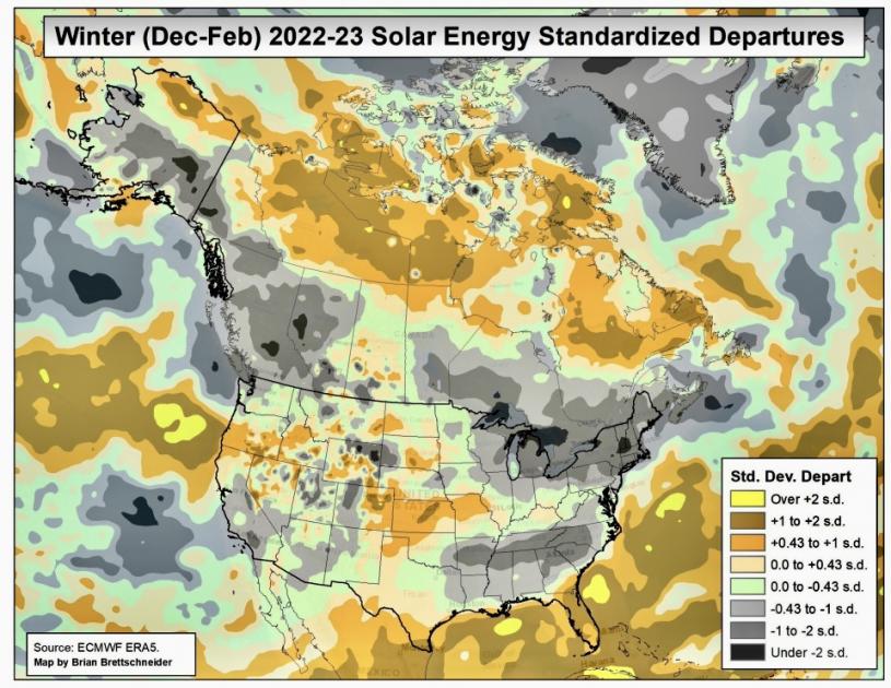 美國國家氣象局阿拉斯加地區的氣候學家Brian Brettschneider在審查ECMRF的數據集時注意到太陽光的缺乏。Brettschneider周三告訴多倫多CTV新聞網:「我很想看看我們這個冬天得到了多少太陽能,所以我製作了這張地圖。」
