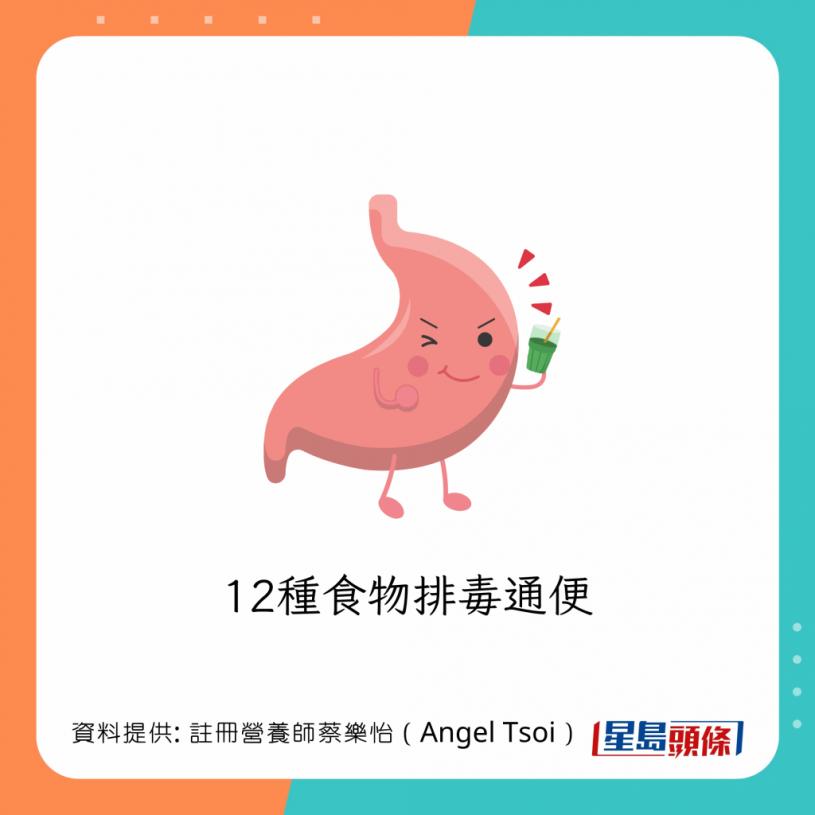 香港注册营养师蔡乐怡曾在米施洛营养师facebook专页推介12种食物,有助通便排毒,增强肠道蠕动,减轻肠胃的负担,并列出6大不同功用,可以为肠胃进行大扫除:
