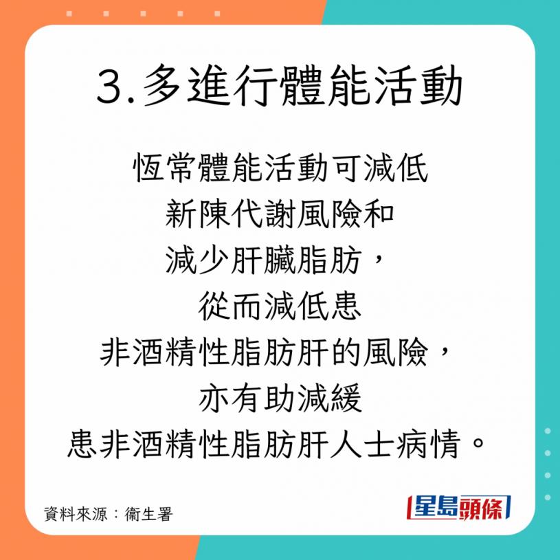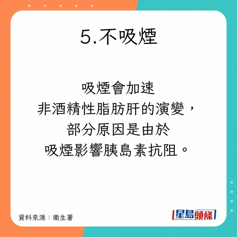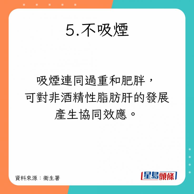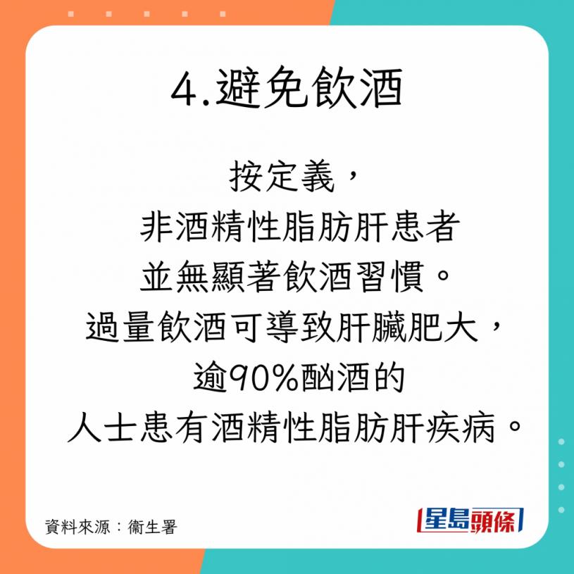 衞生署指,要維持肝臟健康及減低患上脂肪肝的風險,可注意以下6點: