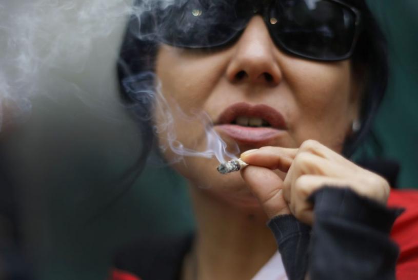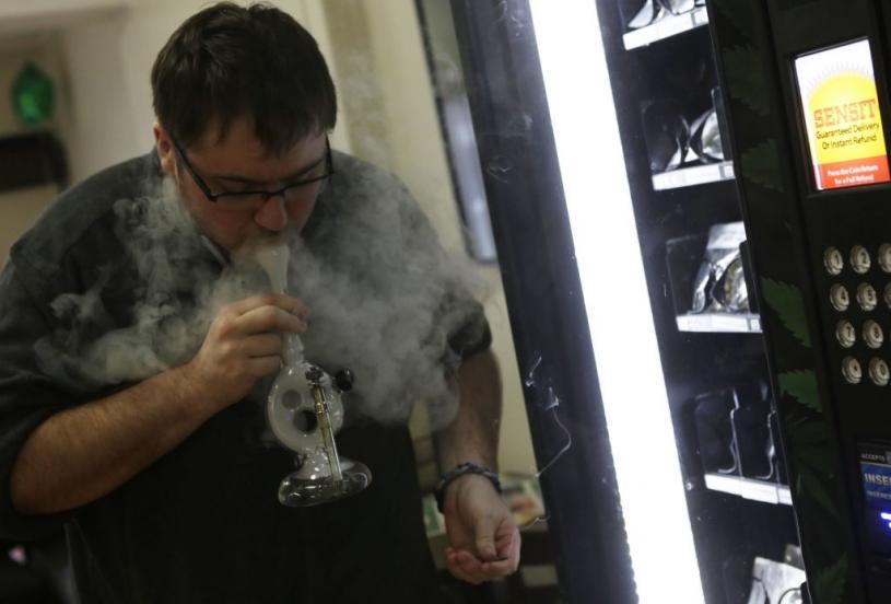 一名男子在温哥华的一间大麻店内吸食大麻产品。