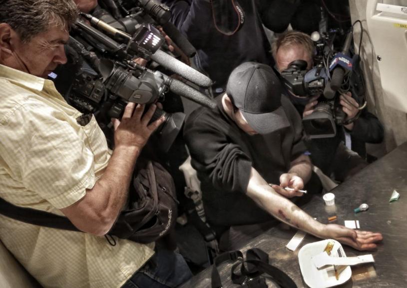 一名男子在温哥华的安全注射屋(Insite),在传媒面前示范注射毒品。