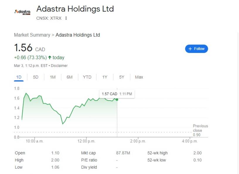 Adastra Labs Holdings Ltd一个月内的股价走势图,显示从2月中到3月3日期间,股价有上升趋势。(网上截图)