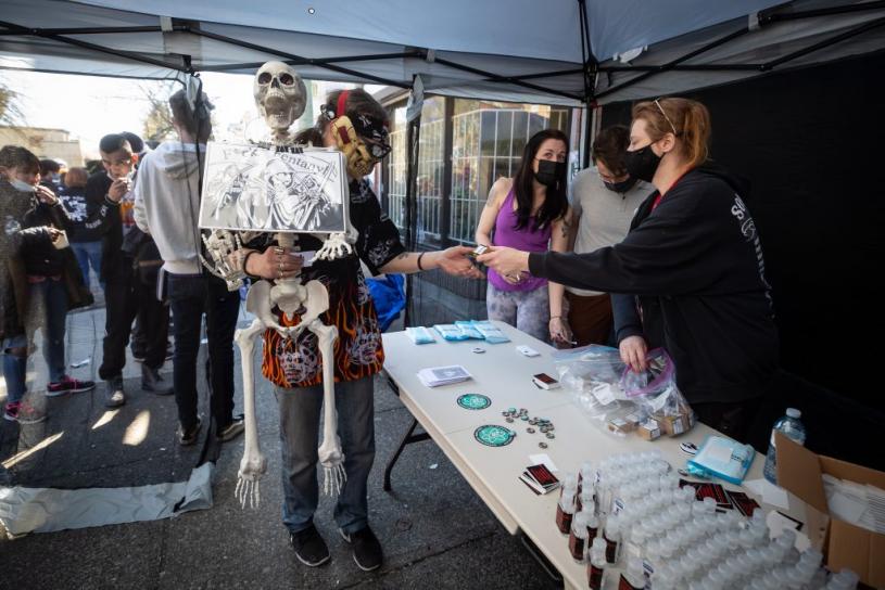 在温哥华举行的国际滥药关注日,当地的社区组织向毒品使用者派发可卡因类的硬性毒品。(加通社资料图片)
