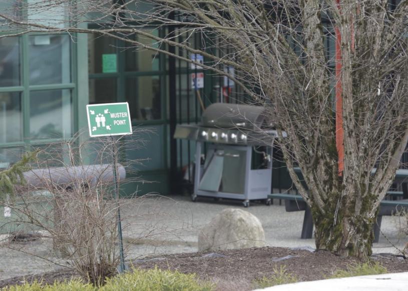 厂房对出的行人路,摆放了写上“muster poin t”的标记牌,方便员工当发生事故时的疏散地点。