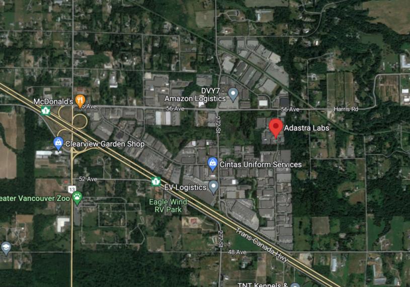 Adastra Labs 位于兰里镇275 街(275th Street)5000 号路段的告罗士打工业园(Gloucester Industrial Park) 内。这个工业园面积颇大,被农地包围,自成一角。