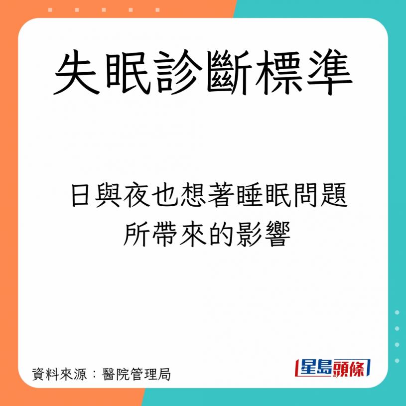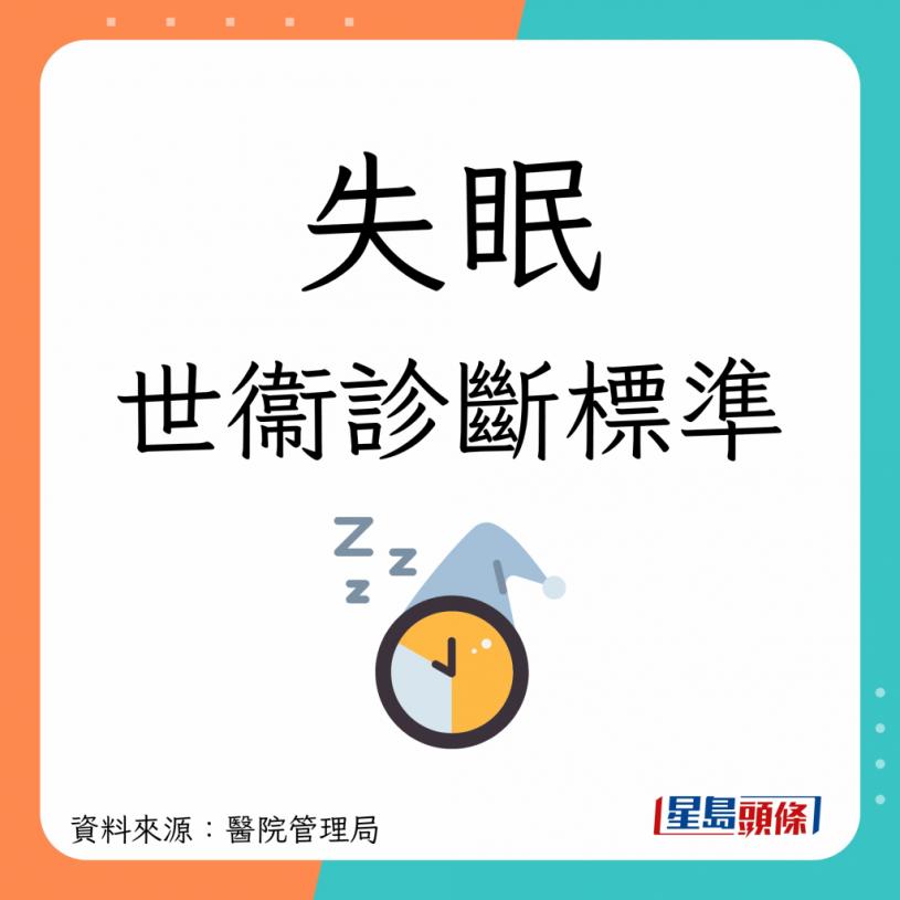 卫生署指,失眠是一种症状、综合症和合并病患,特征包括一系列夜间症状,而世衞亦有一套失眠诊断标准: