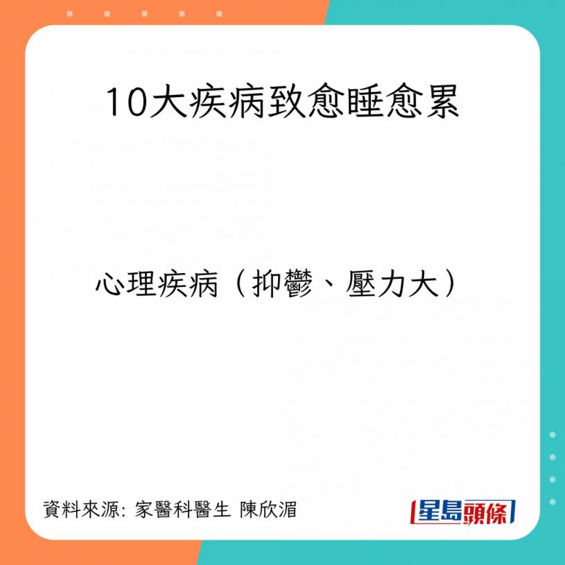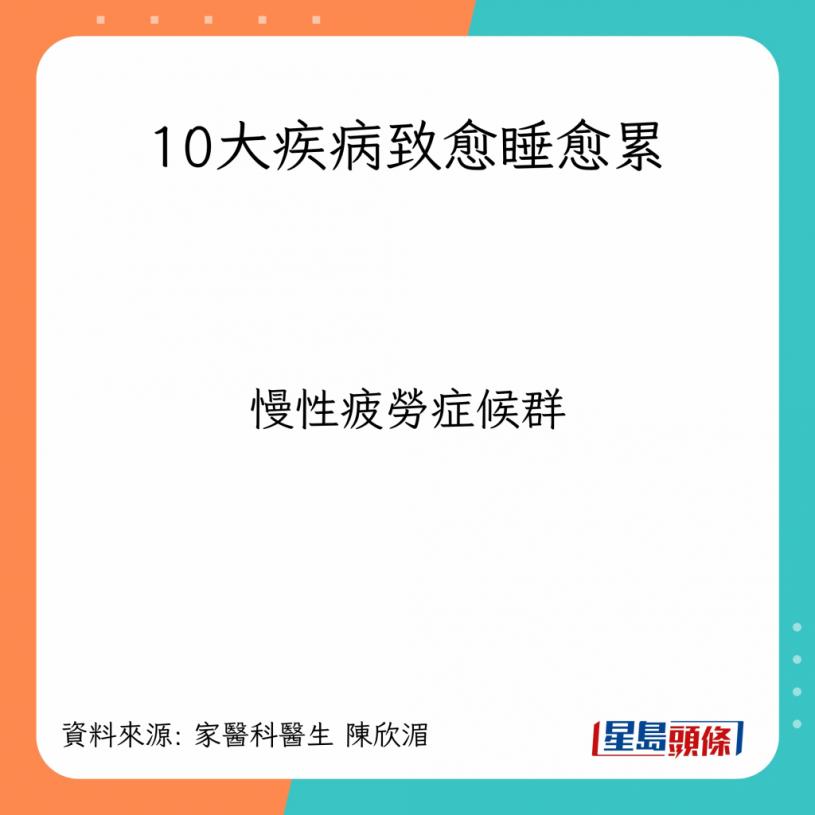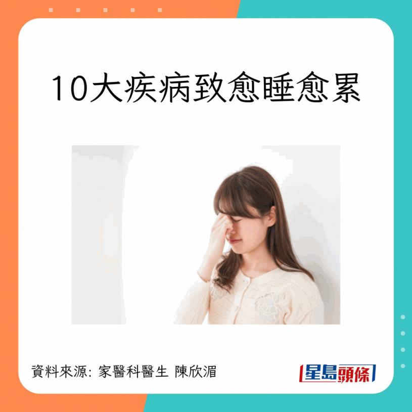 家医科医生陈欣湄在台湾节目《健康好生活》表示,若经常出现疲累感,经过长时间睡眠后仍无法消退,很可能是健康状况响起警号。陈医生解释指,临床上有10大疾病,其症状都会导致患者感到疲倦,令人误以为只是睡眠不足。
