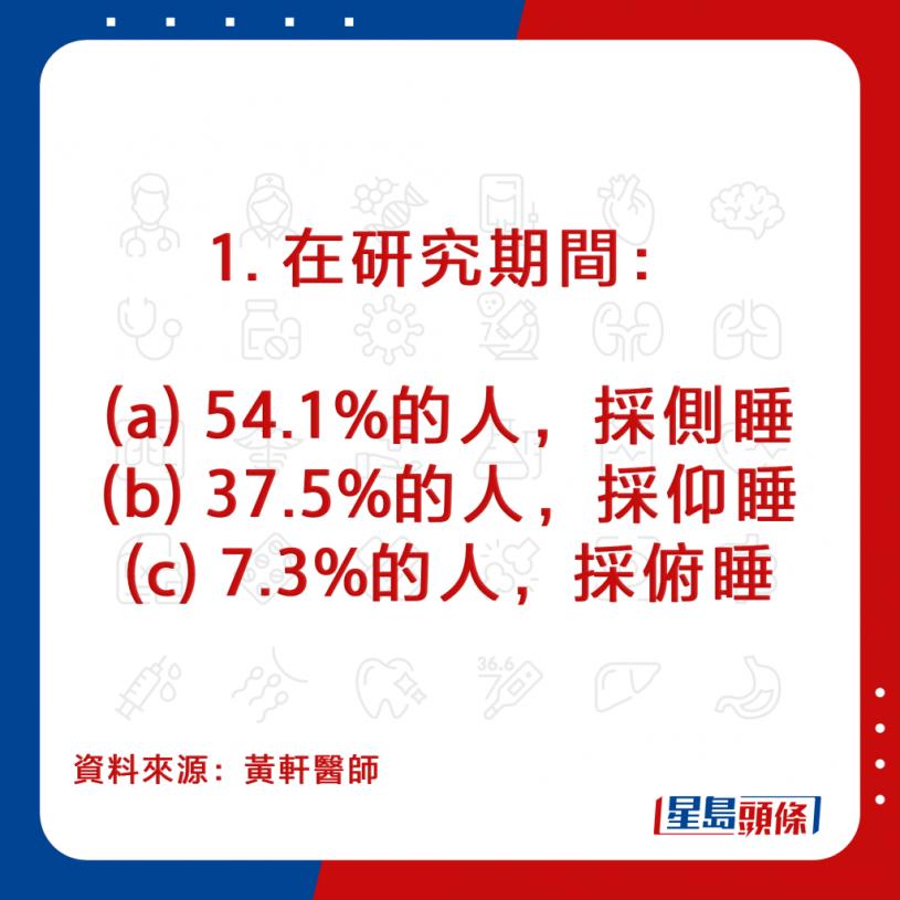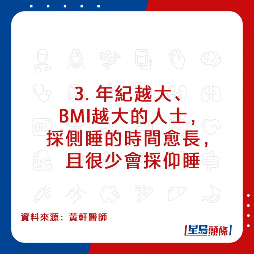 台湾重症医学专科医生黄轩指,每个人都有自己喜欢舒适的睡姿,不过有另一份研究报告显示,脊椎旋转姿势比其他睡姿下更差,且会对脊椎侧弯造成沈重负担。研究证实当人醒来时,如果抱怨比睡觉时身体更疼痛,意味倾向于一直扭曲(rotation)脊椎,造成微肌肉酸痛,增加了压迫的感觉,故或需要尝试改变睡姿。