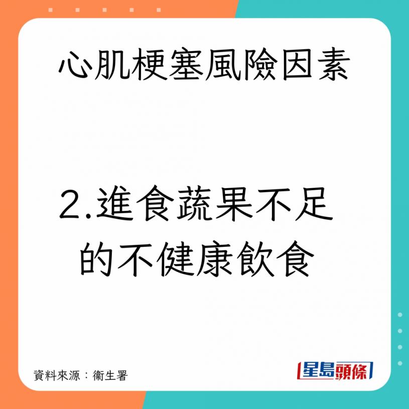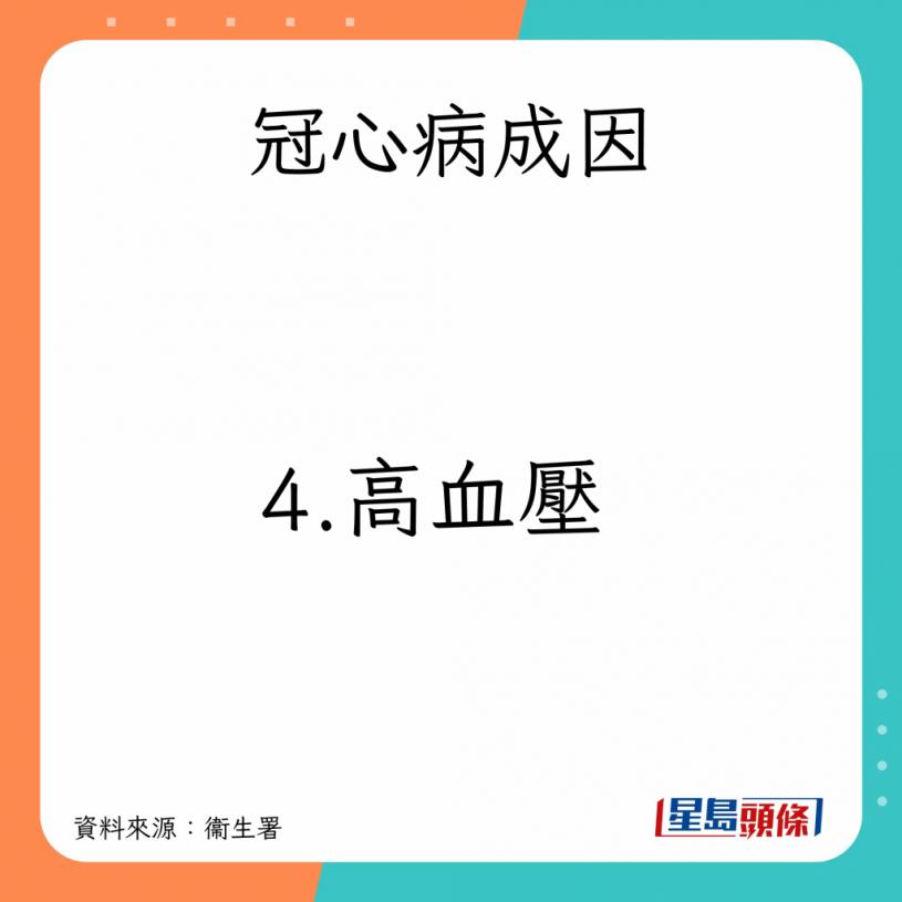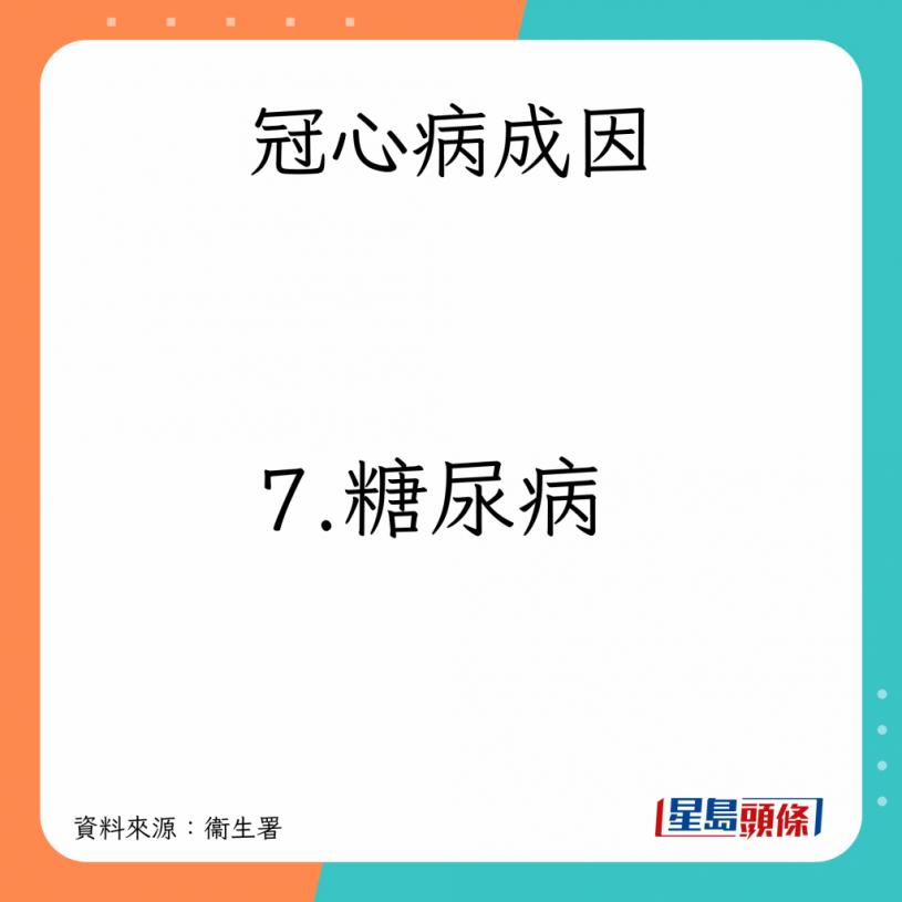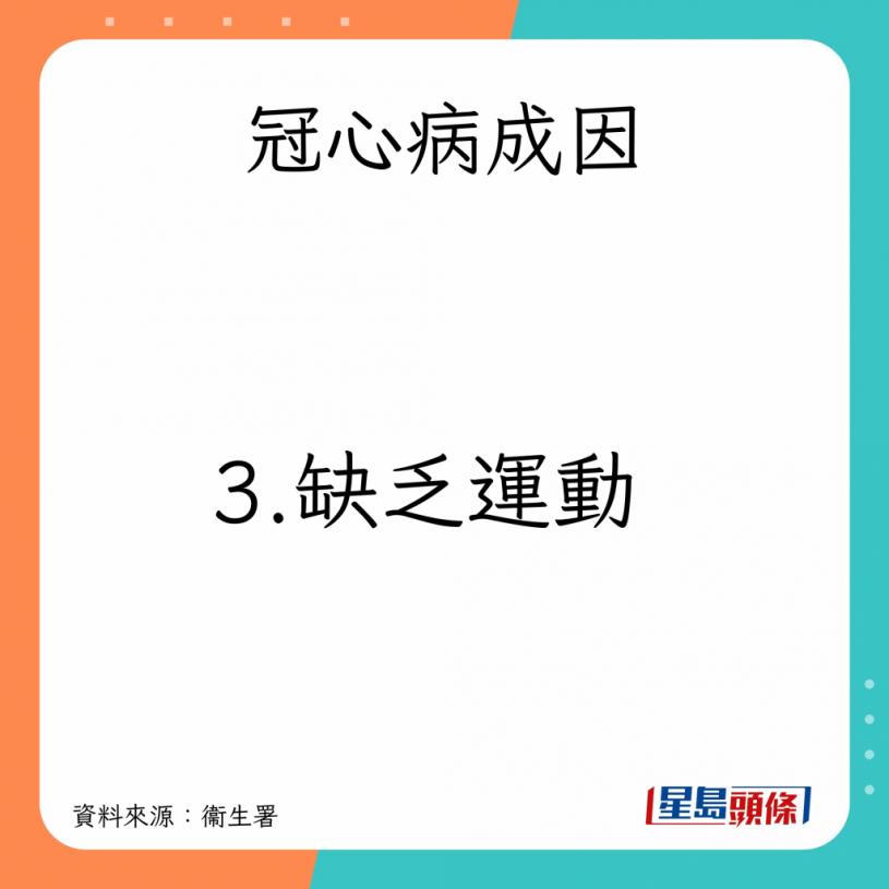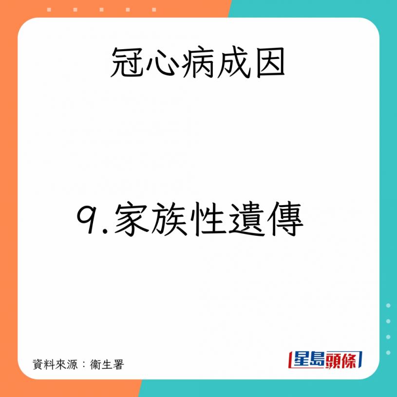 衞生署又指,冠心病由個別或多種因素綜合所致,成因如下: