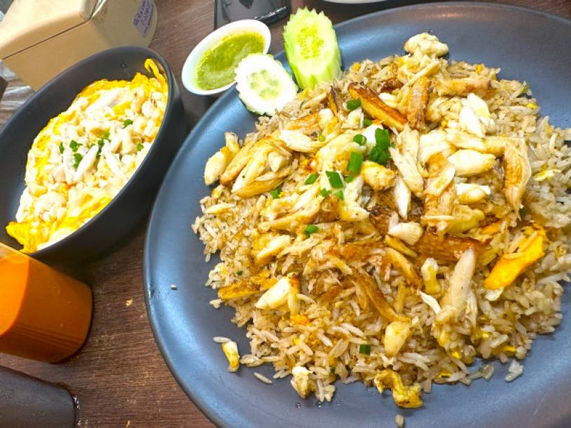 蒙哥蚵仔煎的蠔完全沒有腥味,飽滿新鮮,酥脆的蛋皮配 上酸酸甜甜的泰式甜辣醬,一份售價約合 4 加元。另外,蟹肉炒飯也是該店主打菜式,炒飯採用正宗的泰國絲苗米,粒粒包裹著蛋液,口感非常分明,配上秘製的魚露汁,售價約合 8 加元。