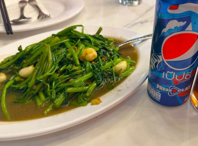 刺身迷在曼谷肯定要嘗試泰式蝦刺身,建興酒家的泰式刺身採用新鮮老虎大蝦,口感爽甜,配上秘製魚露汁,一試難忘。椒絲腐乳炒通菜平常可能經常吃,但建興酒家的泰式炒通菜卻採用較幼的菜苗,這不同於粵菜做法,泰式通菜非常清脆,配上酸辣的蒜蓉汁,卻有另一番味道。三個菜一共消費約 45 元加幣,但有蝦有蟹,也是米芝蓮推薦,價錢尚可接受。