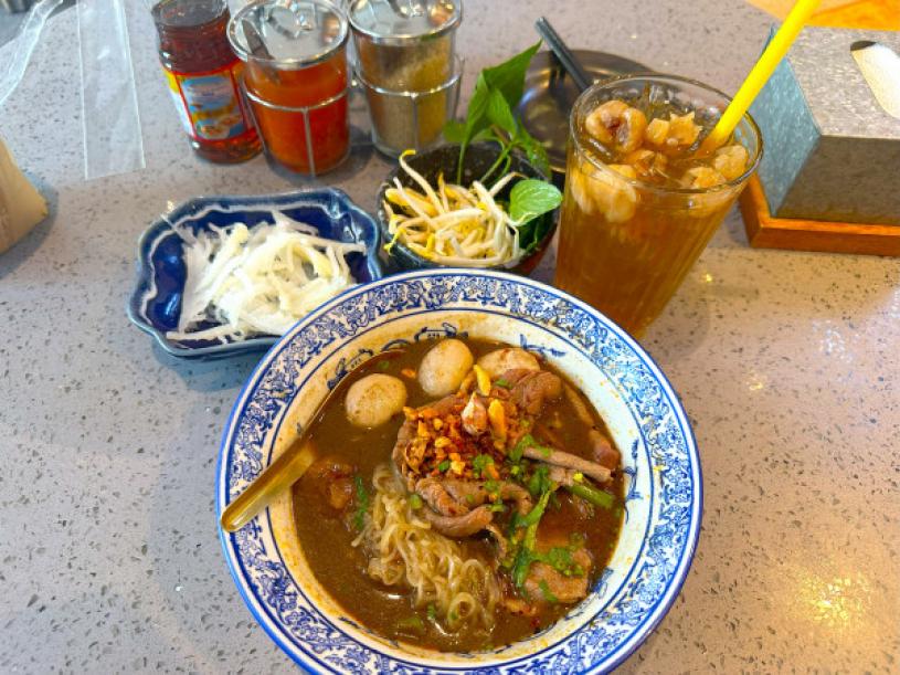 通思密船麵完全改變了船麵的街頭平民印象,更採用澳洲和牛、牛腩肉、黑毛豬等高端食材作為主打菜式。牛肩片加牛丸船麵非常美味,湯底濃郁,麵底非常爽口,牛丸多汁彈牙,牛肉嫩滑,配上一杯冰涼的龍眼水。雖然價錢比街頭船麵貴數倍,最後消費約 25 元加幣,但記者建議在 CentralWorld 購物前來一碗,叉足電再好好血拼!