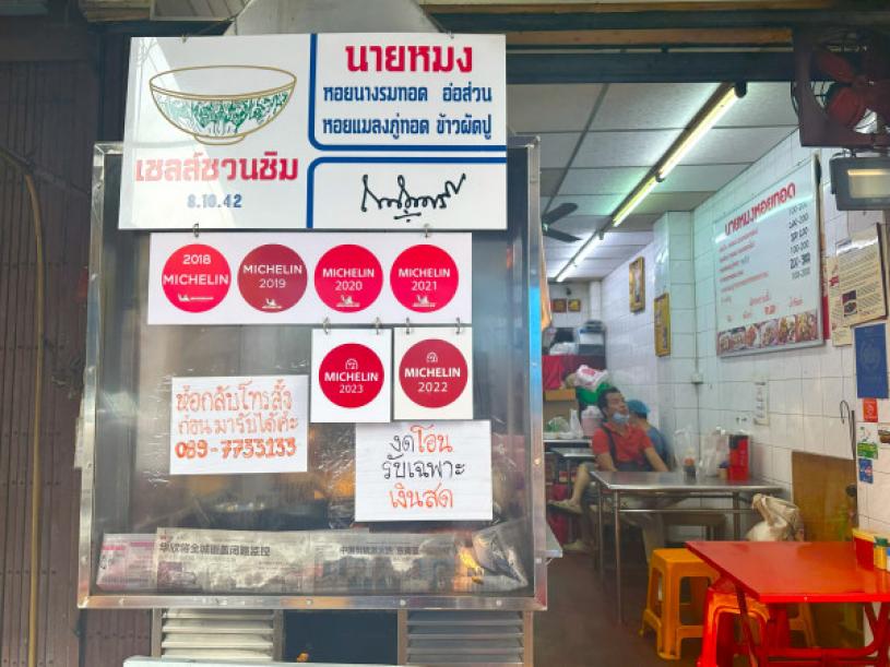 榮獲多年米芝蓮推薦的曼谷華埠老字號蒙哥蚵仔煎 Nai Mong Hoi Thod,店面沒有華麗的裝潢,也沒有優質的貼心服務,但據傳已開業百年歷史,小店門口貼滿連續 5 年的米芝蓮推薦標誌。
