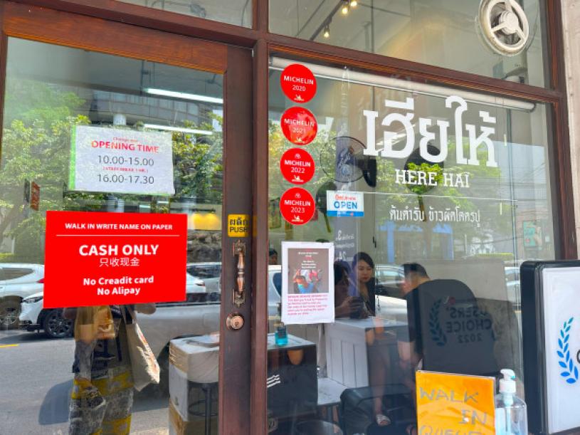 曼谷米芝蓮推薦的街頭海鮮餐廳 Here Hai Restaurant,是一家不起眼的路邊小店,但長長的隊伍成為該店的亮點,店家不設預訂。主打菜式是瀨尿蝦(又稱:皮皮蝦)、蟹腿肉炒飯,以及蟹腿肉炒滑蛋、