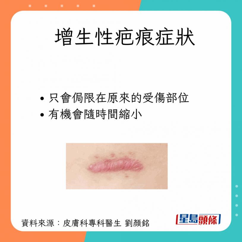 至于蟹足肿,它会向四周蔓延,增生得比原本伤口位置更大,形成像“蟹足”状疤痕,而且不会随着时间变小。蟹足肿最常出现在胸口、背后、肩膀、下巴、耳珠等位置。若蟹足肿长在关节位置,由于疤痕不如正常皮肤般有弹性,有机会限制关节活动能力。