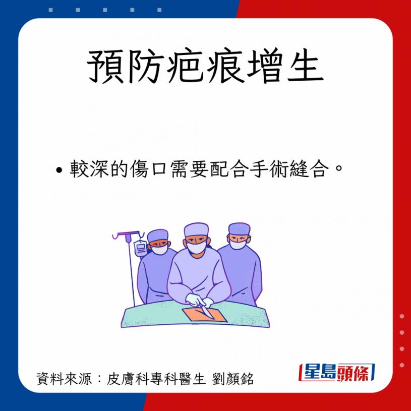 预防疤痕增生最重要是做好伤口清洁护理,避免伤口反复发炎,并要控制感染。较深的伤口需要配合手术缝合。当伤口愈合完成、或手术拆线之后,应及早利用除疤产品,例如硅胶片、硅胶凝胶药膏,以预防疤痕增生。硅胶类产品有助伤口保湿,减少胶原蛋白过度增生,并让胶原蛋白重建正常排列,一般需要持续使用3个月以上,才可达至较好的除疤功效。