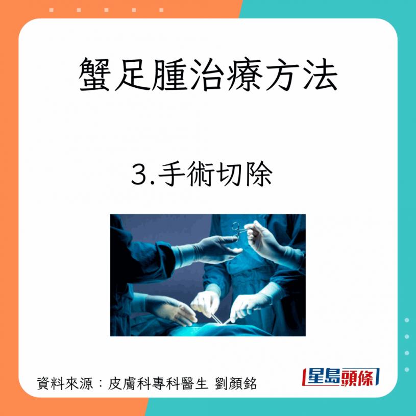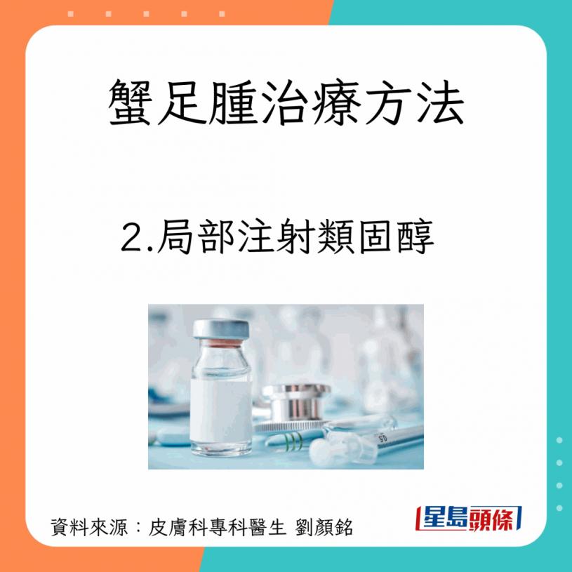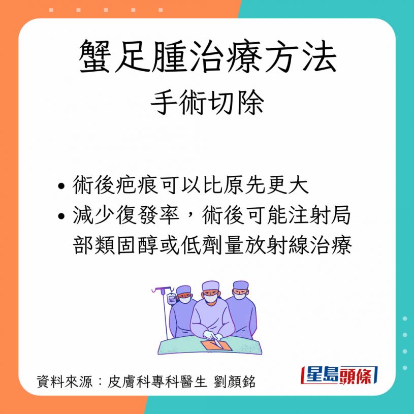 治疗蟹足肿或增生性疤痕视乎疤痕体积、伤口位置等因素决定,治疗方法包括: