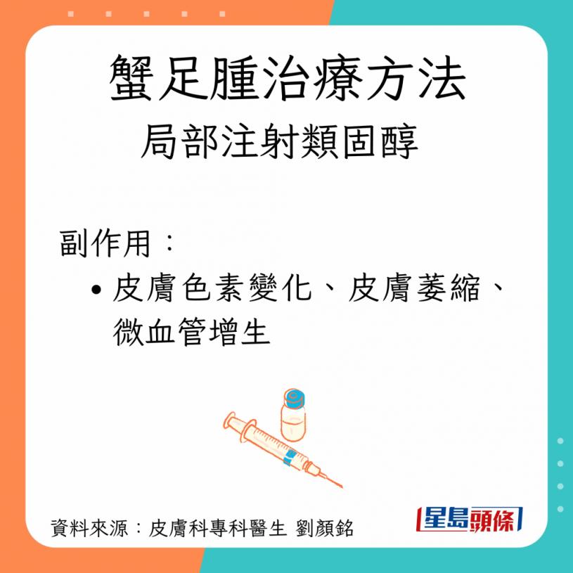 局部注射类固醇可能产生皮肤色素变化、皮肤萎缩、微血管增生等副作用。