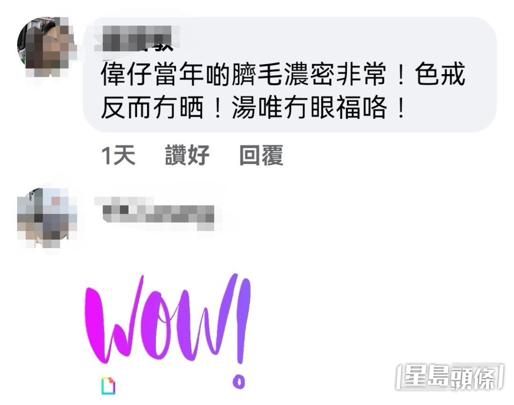 同场还有同期受力捧嘅梁朝伟、刘德华、KK(张国强)、第一代“小虎队”成员蒋庆龙、孙明光、胡渭康及身穿头火红色一件头泳衣嘅戚美珍及当年唱《我为你狂》上位嘅蒋丽萍。相中个个都系嫩嫩的,网民评论个个好瘦,一班都系排骨精,身材如同未发育一样,戚美珍更被批系“飞机场”。除泳裤look哥哥吸睛,高头大马,着住幼边泳裤分腿企嘅胡渭康同样好抢fo,网民指“当年最高最白𠮶个系胡渭康”、“白雪雪滑脱脱”。至于坐喺最侧面嘅黑黑实实刘德华笑容灿烂,信心满满展示“巨雕”,网民话,第一次见刘德华着三角裤。最搞笑有网民留意到伟仔当年啲脐毛浓密非常,话《色戒》反而冇晒,指汤唯冇眼福了。