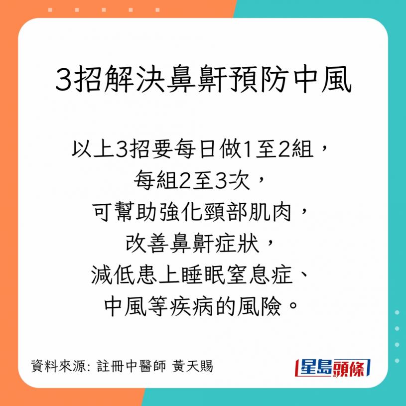 黃天賜醫師又提醒,以上3招要每日做1至2組,每組2至3次,可幫助強化頸部肌肉,改善鼻鼾症狀,減低患上睡眠窒息症、中風等疾病的風險。