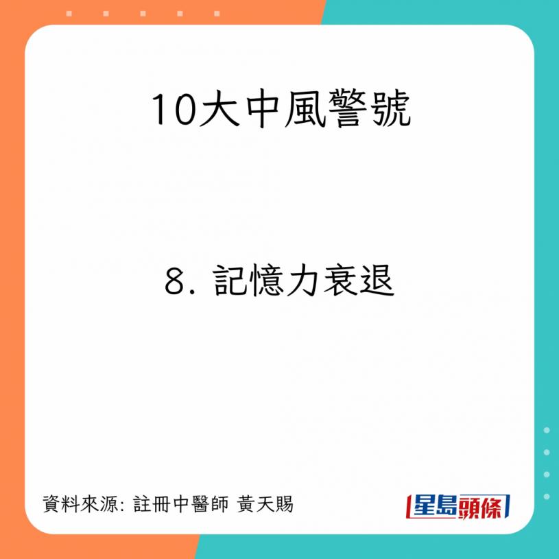 衞生署又指,中風患者會出現9大徵狀。如果同時出現以下多種情況,就應盡快求醫。