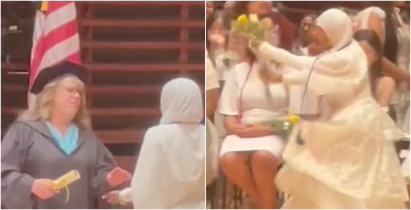 在网上流传的一段视频中,可以看到 17 岁的 Hafsah Abdur-Rahman 站在舞台上,手里拿着一束黄色鲜花,等待被点名。