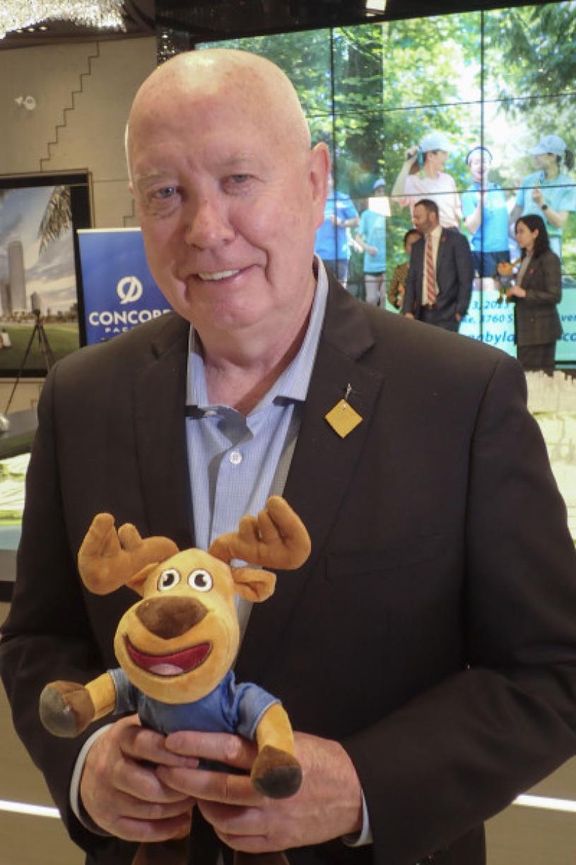 本拿比市长侯迈豪手持LaMoose毛公仔合照。星岛记者夏镇权摄