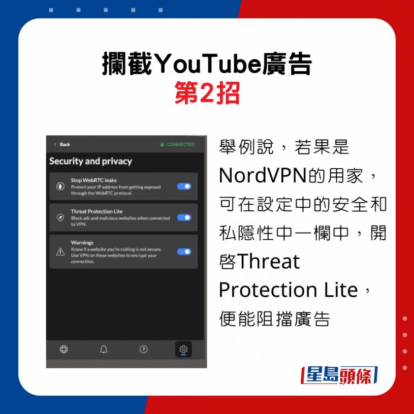 除了采用浏览器的扩充功能之外,VPN其实也能帮忙。VPN是虚拟私人网络,可以保护线上隐私权及资讯不受骇客、互联网服务供应商与第三方的影响,从而可以安全分享及接收数据,而同时VPN亦附广告阻挡的功能,只要开功这功能亦可有效拦截广告。